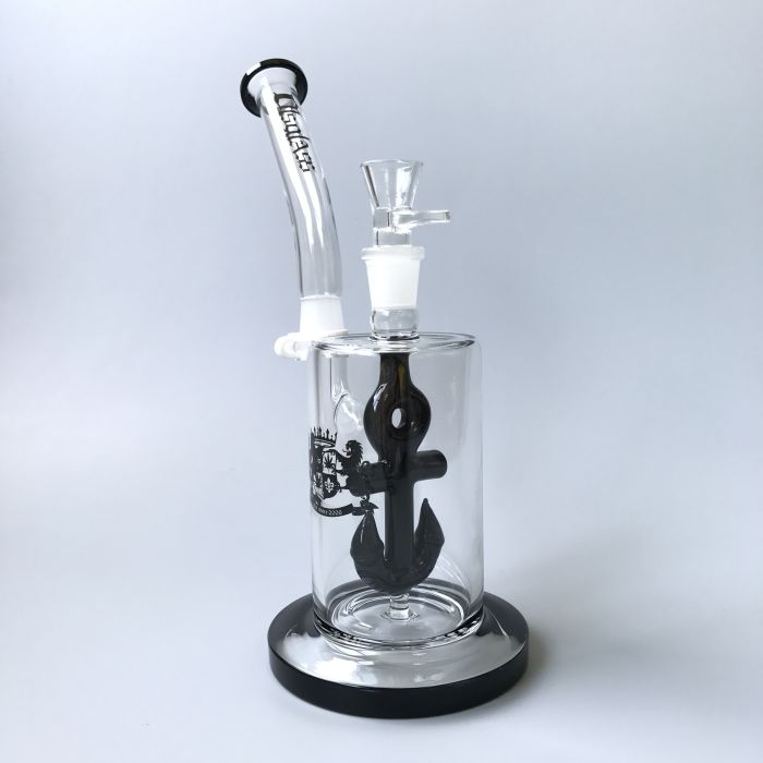 This dab rig is made from quality borosilicate glass and features a functional anchor perc. Features colored glass accents and a bent neck.